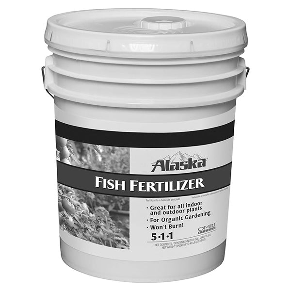 • Alaska Fish Emulsion Fertilizer 5-1-1 5gal For use on all indoor and outdoor plants. This natural organic based fish fertilizer is deodorized with natural wintergreen and won't burn plants.