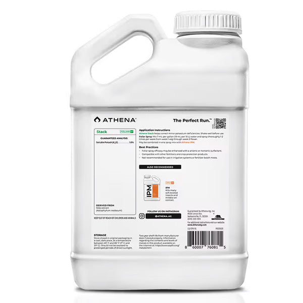 Athena Stack is a natural plant nutrient made from kelp extract. The nutrients in Stack encourage healthy growth and flowering. Stack gives the plant tools to reach its full genetic potential. When used as a foliar, Stack helps correct minor potassium deficiencies.