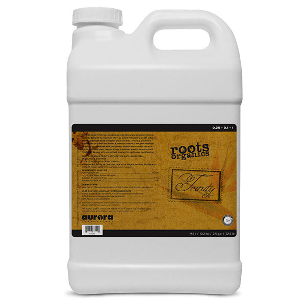Roots Organics Trinity is a complex blend of organic and natural plant nutrients designed for maximum effect as a plant and rhizosphere growth enhancer. With its deliberate blend of distinct plant nutrients, Trinity is a universal supplement for growth and bloom. Trinity is a universal nutrient supplement that can substantially increase vigor and yields during the growth and bloom stages of your soil grown aromatic plants. A distinctive formula of complex carbohydrates combined with soy protein extracts to encourage plant vigor, maximize root growth, and increase fruit and flower yield. Trinity can be used with any nutrient program for increased micronutrient uptake. Trinity can be used with any nutrient program.