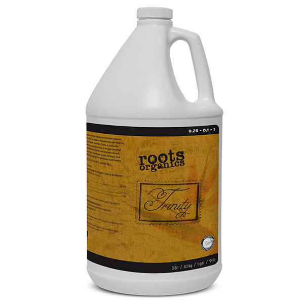 Roots Organics Trinity is a complex blend of organic and natural plant nutrients designed for maximum effect as a plant and rhizosphere growth enhancer. With its deliberate blend of distinct plant nutrients, Trinity is a universal supplement for growth and bloom. Trinity is a universal nutrient supplement that can substantially increase vigor and yields during the growth and bloom stages of your soil grown aromatic plants. A distinctive formula of complex carbohydrates combined with soy protein extracts to encourage plant vigor, maximize root growth, and increase fruit and flower yield. Trinity can be used with any nutrient program for increased micronutrient uptake. Trinity can be used with any nutrient program.
